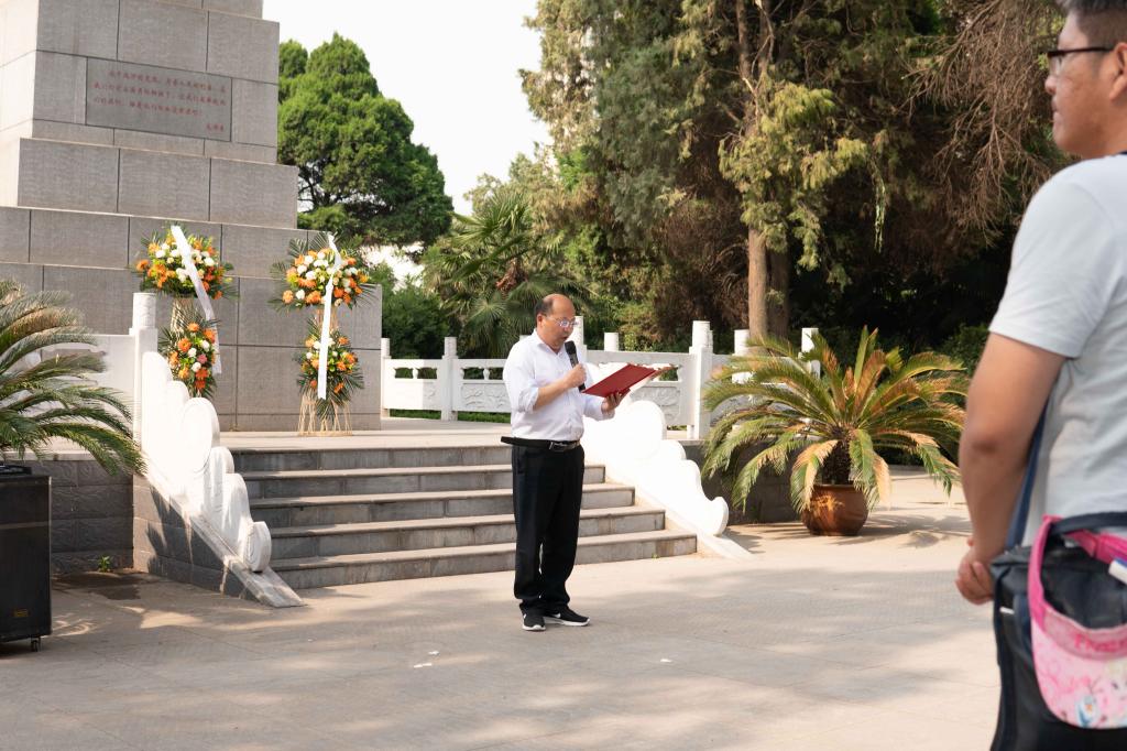 机电工程系党总支书记翟迎朝在临颍烈士纪念碑前为党员和入党积极分子上了一堂生动的党课。他说 ,“忘记历史就意味着背叛”,在中华民族从黑暗走向光明、从贫弱走向富强、从屈辱走向辉煌的征程上,每一滴热血都值得礼赞,每一次牺牲都应当铭记,每一位英灵都永垂不朽。铭记历史、缅怀先烈,常思感恩、传承精神。今天,我们比历史上任何时期都更接近中华民族伟大复兴的目标,也更加需要发扬革命先烈的优良传统,弘扬烈士精神,继承先烈遗志。不忘初心,让红色精神薪火相传;牢记使命,沿复兴之路阔步向前!