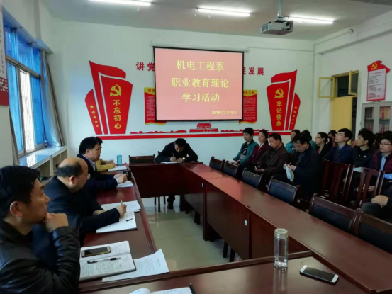 2019年3月18日下午,机电工程系在会议室举行职业教育理论学习活动,全体教师参加,机电系行政负责人赵建功主任主讲,主要学习内容是《国家职业教育改革实施方案》。